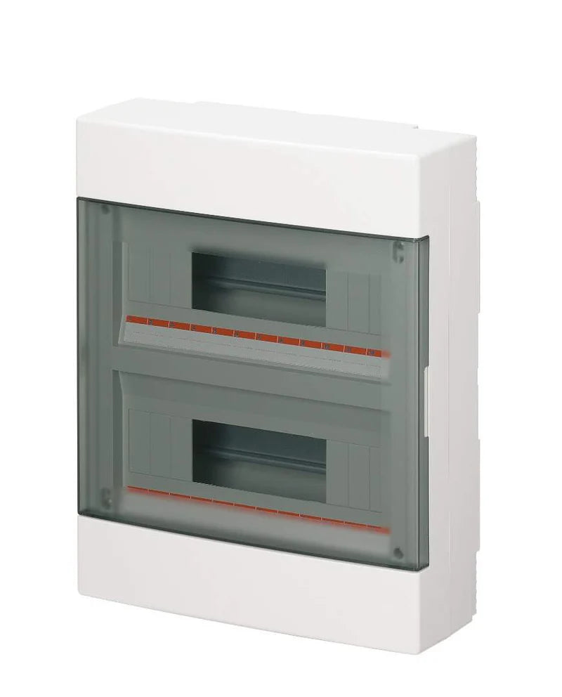 The Elettrocanali 18-module enclosure is a surface-mounted ABS box with IP40 protection, ideal for indoor use. It allows the installation of 18 modules on a DIN rail.